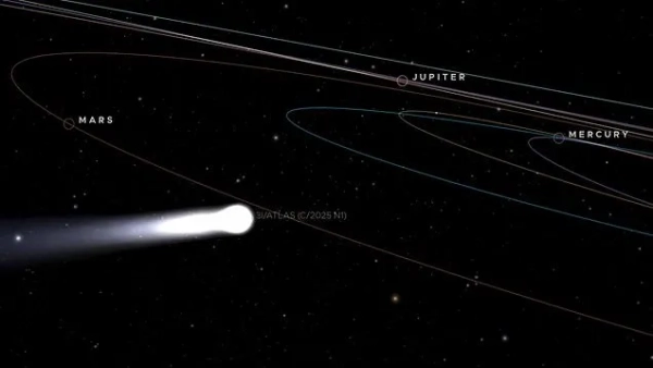 3I/ATLAS вперше помітили в нашій Сонячній системі в липні, і з того часу вона надає астрономам підказки про життя поза нашою Сонячною системою, оскільки це був третій випадок, коли міжзоряний об'єкт потрапив у нашу Сонячну систему. Однак дослідники мали багато теорій щодо комети, зокрема, що це інопланетний зонд для шпигунства за Землею, а також зародок для створення нових планет. Однак очікується, що наступного місяця вона наблизиться до Юпітера, що дозволить космічному кораблю NASA Juno та космічному кораблю Європейського космічного агентства Juice коротко побачити її (Фото: AP)